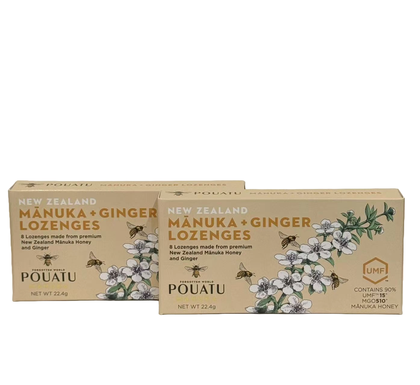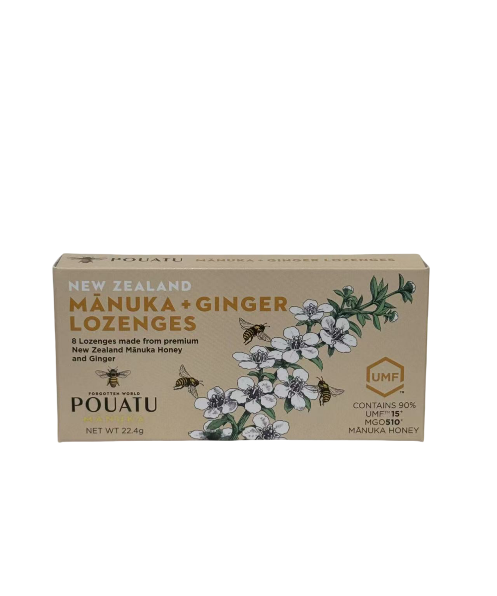 8 lozenges made from Premium New Zealand Manuka Honey and Ginger. Contains 90% UMF 15+ (MGO 510) Manuka honey. Pouatu Manuka Lozenges are made from high-grade UMF 15+ (MGO 510) Manuka Honey. Sourced from the Forgotten World a remote and pristine location in the Taranaki region of New Zealand. A natural tonic for soothing sore throats. Don’t chew, dissolve in the mouth for best results.